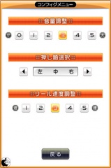 機能ボタンをタップすると、音量調整、押し順選択、リール速度調整を行うことが出来るようになっています。