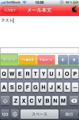 メールの入力は、キーボードアイコンをタップして、キーボードを表示させ、文字入力エリアに文字を入力し、改行ボタンをタップすると、本文に反映されます。