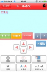デコメールタブをタップすると、テキストの色、揃え位置、サイズ、テキスト効果などを設定出来ます。
