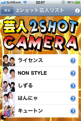 2ショット写真を撮る!をタップすると「ライセンス」「NON STYLE」「しずる」「はんにゃ」「キュートン」が表示されるので、その中から好きな芸人を選択します。
