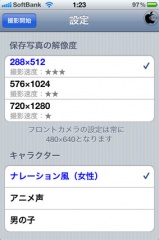 設定では、保存する写真の解像度サイズ、ナレーションのキャラクター切換えを行う事が出来るようになっています。