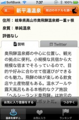 見つかった温泉をタップすると、詳しい温泉施設の情報や、Twitterのツイートなどを見る事が出来ます。
