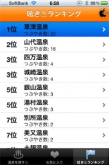 ランキングをタップすると、このアプリを通じてツイートされた、各温泉のツイート数ランキングが表示されます。