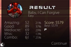 曲が終わると、円をタップしたタイミングと成功回数によって得点が表示されます。