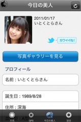 2011年01月18日(火) iPhone App Store#iPhone#iPod_touch#美人天気 美人な女の子が天気を知らせてくれる天気予報アプリ「美人天気」を試す ※本サイトは、アフィリエイト広告および広告による収益を得て運営しています。購入により売上の一部が本サイトに還元されることがあります。 美人天気 ドワンゴが、iPhone/iPod touch用天気予報アプリ「美人天気」を、App Storeにて無料配付を開始していたので試してみました。 美人な女の子が天気を知らせてくれる天気予報アプリです。 最初に地域設定を行います。 地域は複数設定可能で、本体を振って地域変更することが出来ます。 また、天気予報のプッシュ通知にも対応しています。 気になる女性のプロフィールや、写真ギャラリーを見る事なども出来るようになっています。 ↓の評価ボタンを押してランキングをチェック!