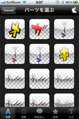 パーツは、文字、効果、吹出し、記号などが用意されていて、パーツをタップすると、写真上に配置されます。