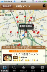 現在地周辺をタップすると、現在地情報を元に地図上にピンが表示され、それぞれのピンをタップすると、店名と、評価の高いラーメンが表示されます。