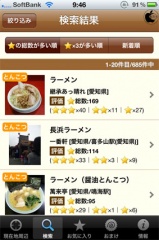 検索タブから、都道府県から地域検索すると、☆の総数が多い順でラーメン店が一覧表示されます。
