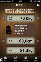 なお、最初に、設定で、身長と、目標体重の設定を行って下さい。