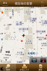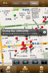 ピンをタップすると店舗名と住所が表示され、iマークをタップすると、店舗の詳しい情報を見る事が出来ます。