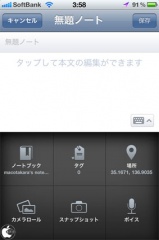 新規ノート画面も変わり、上半分はテキスト入力エリア、下半分には、画像や写真、最長90分の音声録音を添付したり、ノートブックやタグを割り当てたり、位置情報を設定することができるようになっています。
