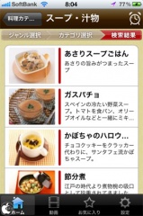 料理カテゴリをタップすると、料理レシピが表示され、材料、作り方を見る事が出来ます。