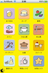 アプリを起動すると、和田誠氏が書き下ろした、おつまみ、スープ、副菜、メイン、ごはん類、めん類、パーティー、お鍋、スイーツ、脇役たち、特急レシピ、お気に入りといったボタンが表示されます。