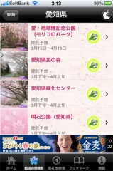 都道府県から探すをタップすると、地域のお花見スポットが一覧表示され、各場所の開花時期予測とともに見る事が出来ます。