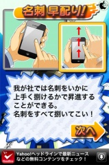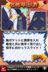 ゲームは2種類有り、名刺早出し!は、スーツなどの胸ポケットに本体を入れて、着信と共に素早く取り出し、画面上の名刺を素早くフリックします。