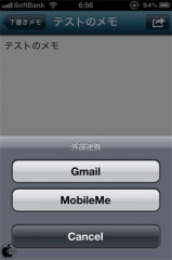 新規メモの作成が完了し、右上のアクションボタンをタップすると、予め、設定した送信先メールアドレスのメール設定項目の名称が表示され、送信アドレスを指定した、新規メールにメモを転載することが出来ます。