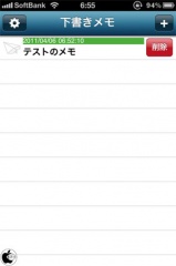 下書きメモリストで、作成したメモをフリックすると、右側に削除ボタンが表示され、メモを削除することが出来るようになっています。