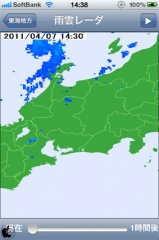雨雲レーダーは、表示されている地域の雨雲状況を見る事ができ、再生ボタンをタップすると、1時間後の雲の動きをシミュレーション表示することが出来るようになっています。