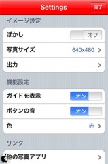 さらに詳細設定をタップすると、ぼかしのオン/オフ、写真サイズ、Twitter投稿設定、ガイドの表示、ボタンの音のオン/オフなどを変更する事が出来るようになっています。