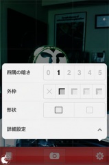 設定ボタンをタップすると、四隅の暗さ、外枠、形状を変更することが出来ます。