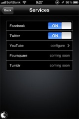Profileをタップして、Servicesを選ぶと、Facebook、Twitter、YouTubeなどと連携することが出来るようになっています。