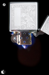 本体を振ると、Zippoのリッド(キャップ)が開き、フリント・ホイールを回すと火がつきます。