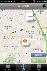 MAPをタップすると、現在地情報を元に、クーポンを利用可能な店舗情報を見る事が出来るようになっています。