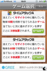 モザイクの中に隠れている物体10問を何秒で当てられるかを競うゲームと、消えていくモザイクの中に隠れている物体を60秒で何問当てられるかを競うゲームを選ぶことが出来ます。