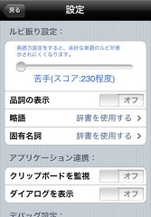 設定では、自分の英語力に応じてルビ振り対象とする英単語・熟語を絞ることが可能で、他のアプリでコピーした英文を本アプリ内でルビ振りする設定を行う事も出来ます。