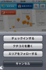 お店スポット情報から、お店にチェックインしたり、クチコミを投稿したり出来ます。