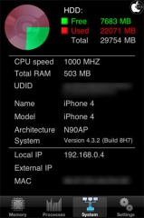 Systemをタップすると、ディスクの使用状況、端末のUDID番号、システムバージョン、IPアドレス番号などの情報を見る事が出来るようになっています。