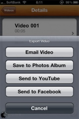 Shareボタンをタップすると、メール添付、写真ライブラリー保存の他に、YouTube、Facebookに投稿することが出来るようになっています。