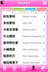 プロフィールタブは、チームA、チームK、チームB、研究生に分かれて、メンバーのプロフィールを見る事が出来ます。