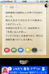 2011年05月19日(木) iPhone App Store#iPhone#iPod_touch_(4th_generation)#オーラ測定カメラ オーラ測定カメラアプリ「オーラ測定カメラ」を試す ※本サイトは、アフィリエイト広告および広告による収益を得て運営しています。購入により売上の一部が本サイトに還元されることがあります。 オーラ測定カメラ ユアネットが、iPhone/iPod touch (4th generation)用オーラ測定カメラアプリ「オーラ測定カメラ」を、App Storeにて無料配付を開始していたので試してみました。 オーラを測定できたかのように見える面白カメラアプリです。 アプリを起動して、スタートボタンをタップし、カメラボタンをタップすると、カメラが起動して、顔の位置を合わせるフレームが表示されます。 フレームに顔が収まるように撮影を行います。 撮影を行ったあと、ランダムな色でオーラが合成された画像が表示されます。 オーラの色には意味があり、色のボタンをタップすると、オーラ色の意味を読む事が出来ます。 ↓の評価ボタンを押してランキングをチェック!