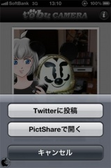 SHAREボタンをタップすると、Twitterに投稿したり、PictShareアプリを利用して、複数の写真ネットサービスに投稿したり出来るようになっています。
