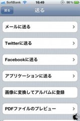 送るでは、メール転送、Twitterやfacebook投稿、アプリ転送などが行えるようになっています。