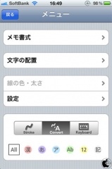 メニューボタンをタップすると、メモ書式、文字の配置、ストロークなどを変更することが出来ます。