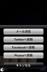 撮影後、静止画の場合は、メール送信に加えて、Twitter、Facebook、Picasaに投稿でき、動画の場合は、メール送信に加えて、YouTube投稿が出来るようになっています。
