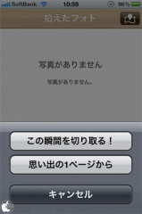 カメラボタンをタップすると「この瞬間を切り取る!」(カメラで撮影)、「思い出の1ページから」(写真ライブラリーから写真選択)のボタンが表示されるので、どちらかをタップします。