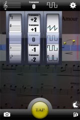 画面上のボタンをタップして、トランスポーズ、チューニング、音色の選択などが出来るようになっています。