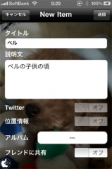 アプリのホームから、右上のカメラアイコンをタップして、カメラで写真を撮影するか、写真ライブラリーから写真を選択し、タイトル、説明文などを入力してアップロードすることが出来ます。