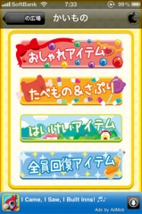 かいものをタップすると、おしゃれアイテム、食べ物&サプリメント、背景、全員回復アイテムなどを購入することが出来ます。