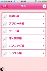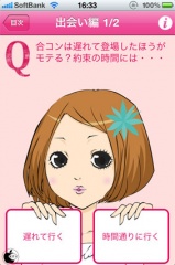 出会い/アプローチ/デート/恋人関係/ハプニング/トラブルのジャンルが用意されていて、無料版では、そのうち12問を試す事ができます。