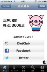 2011年08月11日(木) iPhone App Store#iPhone#iPod_touch#カロリーメイド カロリー目利き力をアップ出来るカロリークイズアプリ「カロリーメイド」を試す ※本サイトは、アフィリエイト広告および広告による収益を得て運営しています。購入により売上の一部が本サイトに還元されることがあります。 カロリーメイド イードが、iPhone/iPod touch用カロリークイズアプリ「カロリーメイド」を、App Storeにて無料配付を開始していたので試してみました。 カロリー2択クイズでカロリー目利き力をアップするクイズゲームアプリです。 スタートすると2つのメニュー名が表示されるので、カロリーが低いと思う方をタップします。 直ぐに判定結果が表示され、両方のカロリー数が表示されます。 全ての問題に回答すると正解数と得点が表示されます。 得点は、ダイエットクラブ、Facebook、Twitterに投稿することが出来ます。 ダイエットクラブアカウントを持っている、ランキングに参加することが出来ます。 ↓の評価ボタンを押してランキングをチェック!