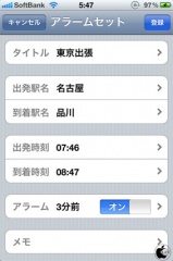 出発駅、到着駅、それぞれの時間、アラーム設定などを行います。
