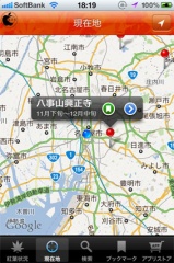 現在地をタップすると、現在地情報を元にGoogleマップが表示され、紅葉スポットがピンで表示されます。