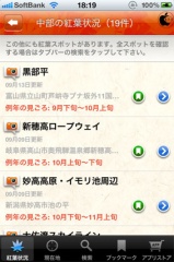 すると、その地域の紅葉状況がリスト表示されます。