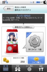 嫁一覧から「ガチャる」をタップし、所持しているコインを使って回しカードなどを入手します。