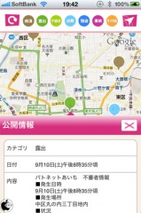 地図をピンチ操作で拡大/縮小すると、痴漢、不審者といった犯罪情報がアイコン表示されます。
