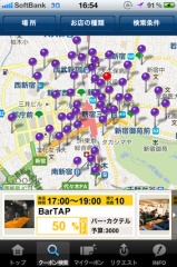 「お店・クーポン検索」をタップすると、現在地周辺のお店・クーポン情報が地図上に表示されます。
